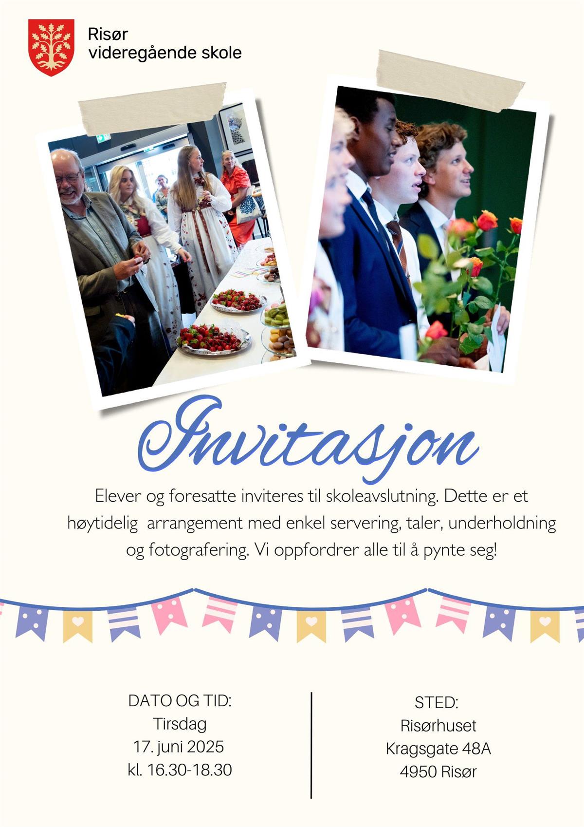 Velkommen til skoleavslutning for elever og foresatte tirsdag 17. juni 16:30- 18:30 for elever ved Vg2 yrkesfag og Vg3 studiespesialiserende.Invitasjon til skoleavslutning for Vg2 og Vg3 elever ved Risør videregående skole RVS